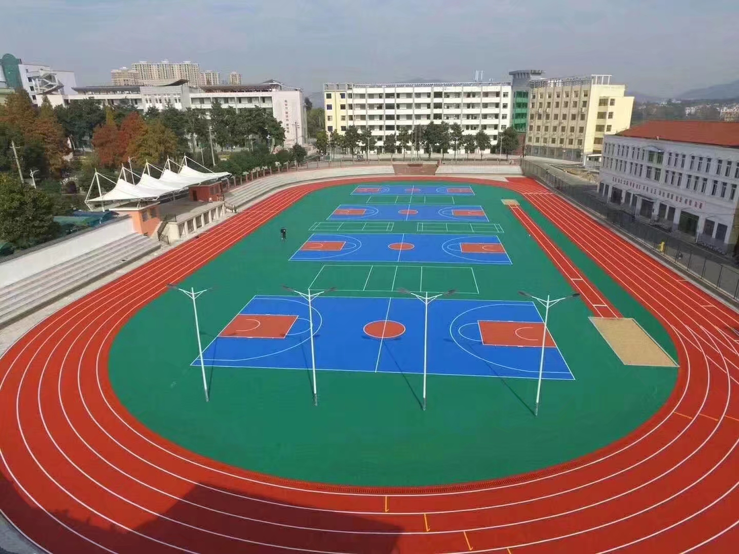 EPDM颗粒是体育塑胶跑道的主要成分之一。EPDM橡胶是一种合成材料,具有优异的弹性、耐磨损以及抗老化等特性。它能够有效吸收运动员的冲击力,并提供良好的回弹性,减轻脚部受力压力。同时,EPDM颗粒还具备防滑、耐候性好的特点,能在各种气候条件下保持稳定的性能,确保运动员的安全和舒适感。面层材料:PU漆体育塑胶跑道的面层通常采用PU漆(聚氨酯漆)。这种特殊的涂层材料在运动场地表面形成一层坚固、耐磨的保护层。PU漆具有优良的耐候性、耐磨性和耐化学性,能够有效防止紫外线辐射和污染物侵蚀,延长跑道的使用寿命。此外,PU漆还具备优异的弹性和抗滑性能,使得运动员在奔跑时更加稳定和舒适。